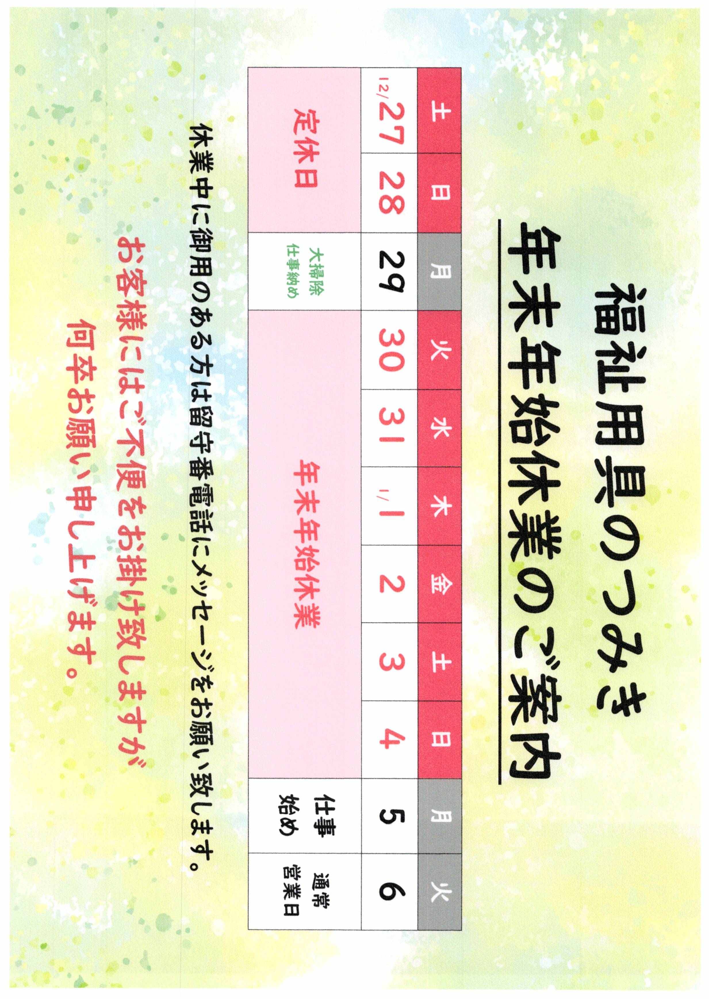【福祉用具のつみき】 12月30日(火)〜1月4日(日)まで休み 1月5日(月)〜通常営業 ※12月27日(土)・12月28日(日)は定休日となります。